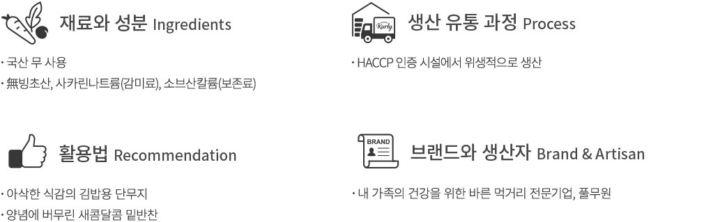 - 해당 제품은 일반 단무지 제품들과 달리 조미액에 색소가 들어가지 않았기 때문에 "백색 단무지"라는 명칭을 사용하였습니다. 본래 자연 숙성이 된 절임무는 숙성 기간에 따라 색이 점점 노랗게 변할 수 있습니다. - 해당 상품은 근래 이슈된 절임류 생산처와는 무관한 상품임을 안내드립니다.