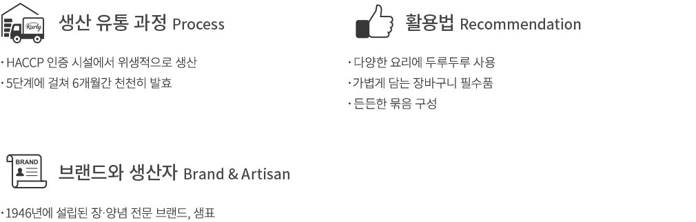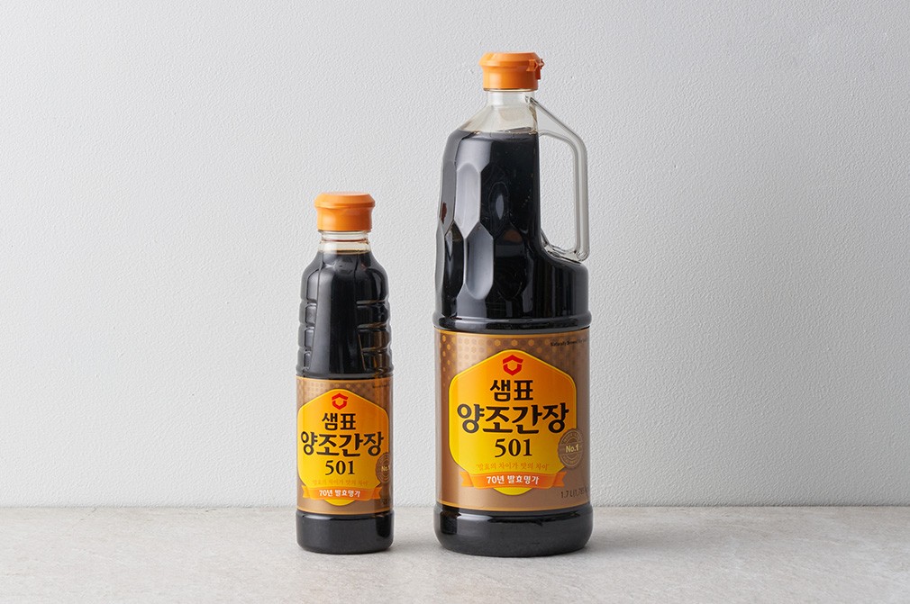 샘표 501 양조간장은 70여 년간 변치 않고 대한민국 주부들의 사랑을 듬뿍 받는 간장이에요. 간장의 맛있는 향을 내기 위해 우량 효모를 선별해 배양한 다음, 6개월간 천천히 발효시켜 만들었지요. 간장 속 질소함량을 의미하는 ‘맛있는 발효지수(TN)’가 1.5로 높은 특급 간장이기에, 풍부한 향미로 맛의 깊이를 더하기 좋을 거예요. 넉넉한 1.7L 본품에 500mL 1병을 함께 보내 드리니, 두고두고 활용해 보세요.