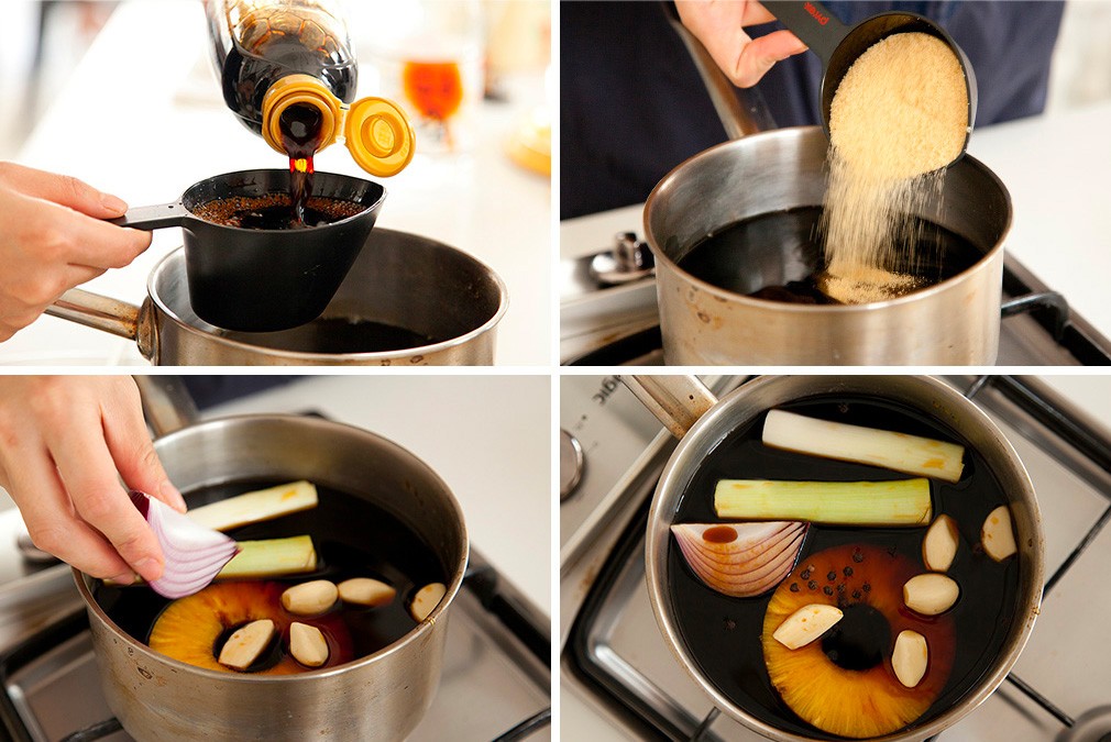 재료 국산콩 간장 2컵, 미림 2컵, 설탕 1/2컵, 파인애플 1조각, 대파 흰 부분 2~3대, 양파 1/2개, 통후추