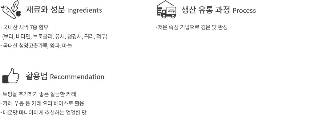 ・특징 : 저온 숙성 과정을 거쳐 깊은 맛을 완성한 매운 채담카레입니다. 새싹의 생생함에 화끈한 매운 맛이 더해졌어요.