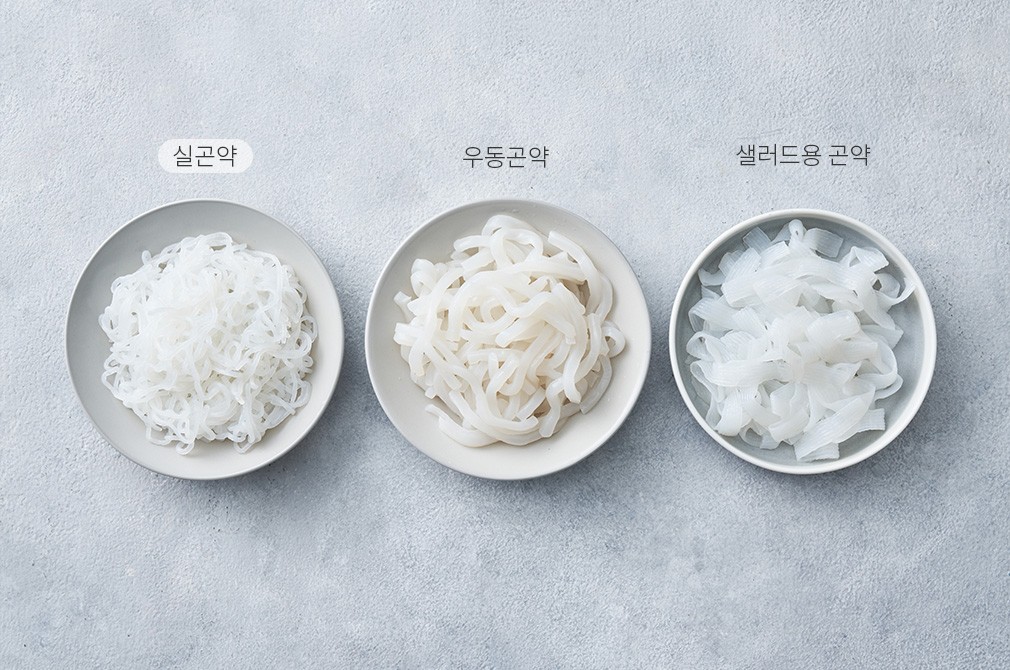 구입 전 참고사항 ・곤약면의 굵기를 사진으로 비교해 보세요. 곤미방의 실곤약은 가장 얇고 긴 형태로, 일반 불린 당면과 유사한 생김새를 띱니다.