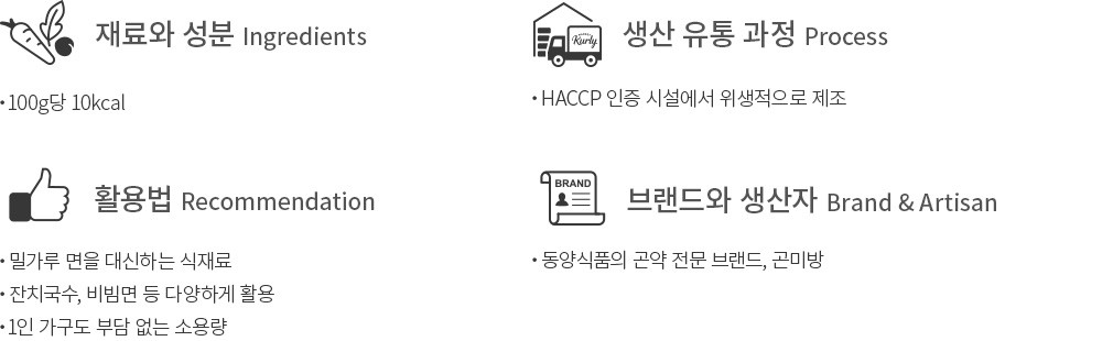 가볍고 부담 없이 즐길 수 있는 식재료로 곤약을 찾는 분들이 많아졌어요. 특허*받은 기술로 다양한 곤약 제품을 선보이는 곤미방이 활용도 높은 실곤약을 준비했습니다. 일반 당면처럼 얇고 길지만 곤약 특유의 식감을 살린 제품인데요. 멸치 육수를 부어 뜨끈한 잔치국수로, 갖가지 채소와 매콤한 양념장을 넣고 비벼 비빔면으로 즐겨도 좋아요. 라면사리나 우동사리 대신 요리 부재료로 활용해도 제격이랍니다. 탱글탱글한 식감은 물론, 포만감까지 모두 챙길 수 있으니 가볍게 담아가 보세요.