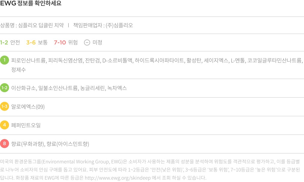 EWG에 대한 컬리의 생각 컬리는 화장품, 샴푸, 치약, 세제 등 우리의 인체에 닿는 리빙 제품의 전성분을 공개하고 성분의 위험 정도를 EWG 기준에 따라 1~10 숫자로 안내하고 있습니다. EWG가 세계적으로 널리 사용되는 신뢰할 수 있는 척도인 것은 맞지만, 상품의 안전성을 증명하는 절대적인 기준은 아니에요. EWG로부터 좋지 못한 평가를 받은 성분에 대해 전문가와 유관기관은 '권고 기준치를 지켜 사용할 경우 무해하다'고 평가하기도 합니다. 이에 컬리는 EWG 등급과 인터넷에 떠도는 단편적인 정보에만 의존하지 않고 식품의약품안전처, 에코서트(ECOCERT), 미국식품의약국(FDA), 미국화장품원료검토위원회(CIR)등 공신력 있는 인증기관의 의견을 참고하여 유해성 여부를 꼼꼼하게 따져 보고 있습니다.