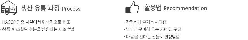 사과의 싱그러운 풍미를 오롯이 간직한 영주 햇살듬뿍 사과즙을 만나보세요. 깐깐하게 고른 국내산 사과만을 착즙한 다음, 섬세한 필터로 걸러 한 포에 담았답니다. 사과즙을 착즙 후 소실된 수분을 환원하는 공법으로 깔끔하고 부드러운 목넘김을 느낄 수 있어요. 외출 시 간편하게 챙겨 다니며 하루에 1~3포씩 드셔보세요. 넉넉한 30개입 구성이니, 소중한 분들께 마음을 전하는 선물로도 참 좋을 거예요.