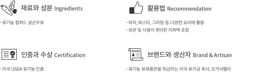 1988년 미국 중서부 농부들에 의해 설립된 유기농 생산조합, 오가닉밸리의 유기농 마일드 체다 치즈를 소개할게요. 유기농 우유를 사용했기에 더욱 안심하고 사용할 수 있는 것은 물론, 체다 치즈 특유의 짭조롬함과 향긋한 풍미가 살아있답니다. 치즈를 적당한 두께로 컷팅해, 어떤 요리든 솔솔 뿌려 즐기기에도 간편하지요. 피자, 파스타 등 치즈가 필요한 요리에 올려 부드럽고 고소한 감칠맛을 더해보세요. 지퍼백에 담겨 있어 깔끔하게 보관하기에도 좋을 거예요.
