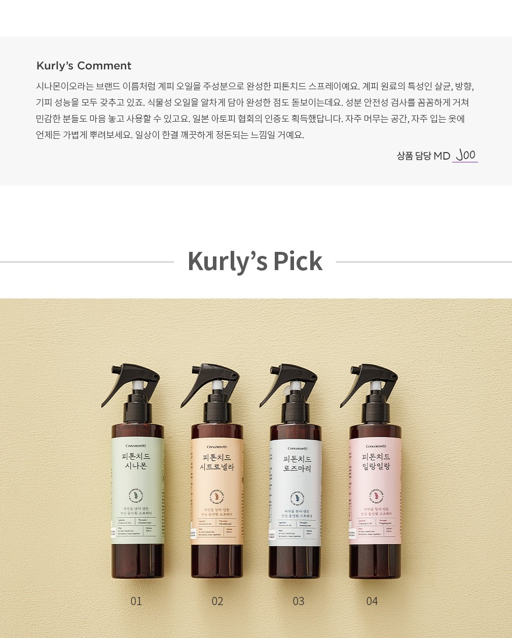 ・ 특징 : 방충, 탈취, 방향의 기능을 갖춘 항균 스프레이입니다. 계피 오일을 주성분으로 로즈마리 오일, 일랑일랑 오일, 파인 오일을 더해 완성했어요.