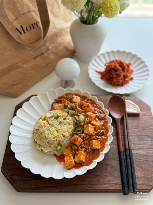 이렇게 간단하게 한 그릇 요리로 마파두부와 계란 볶음밥 만들기가 완성되었어요. 이제 야무지게 비벼 드시면 되겠죠? 맛있고 간단한 마파두부 만들기! 한 그릇 요리로 어떠신가요?