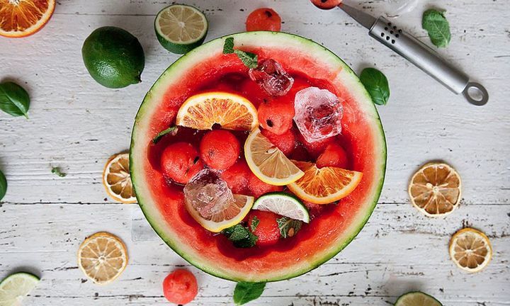 마무리는 각자의 센스에 따라 허브 잎이나 말라가는 오렌지, 레몬 조각 등을 몇 개 올려주시면 붉은 수박 속살과 환상적으로 어울립니다.