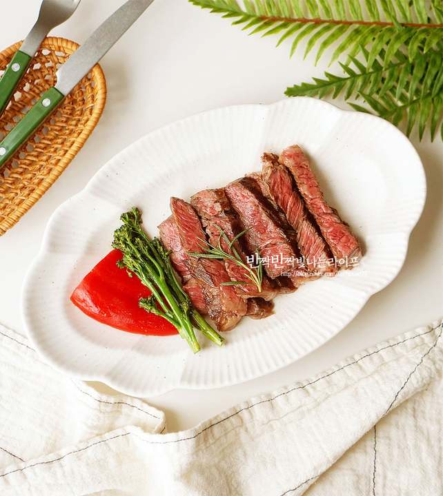 스테이크 부위는 등심, 안심, 채끝 등 입맛에 맞게 선택하며, 두께는 약 2cm로 준비합니다. 핏물을 제거한 뒤 소금, 후추로 기본 시즈닝을 하고, 허브갈릭 솔트나 스테이크용 시즈닝으로 풍미를 더하면 좋습니다.