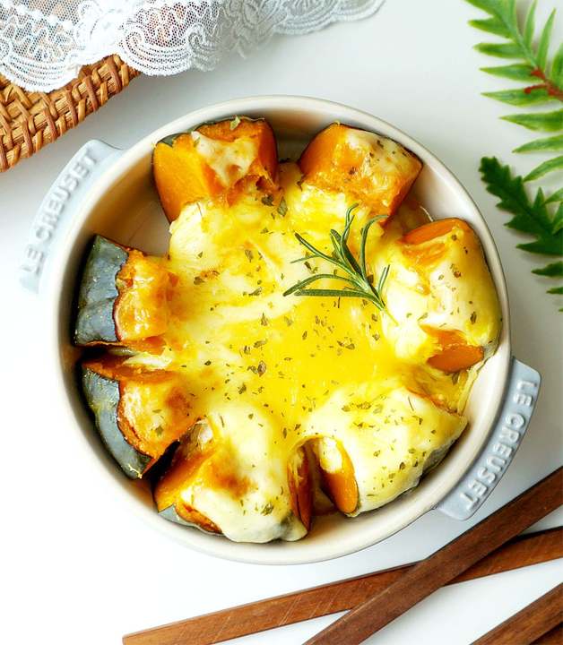 전자레인지용 용기에 단호박을 올리고 남은 치즈와 슬라이스치즈를 듬뿍 얹은 뒤 파슬리가루를 뿌립니다.