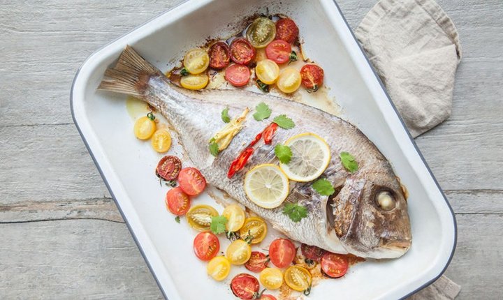 오븐 용기에 도미를 담고 방울토마토를 골고루 얹은 뒤 고수를 위에 올린다.