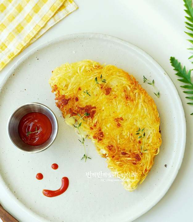 바삭하게 구운 감자전은 간단하고 맛있으며 토마토케첩을 더하면 아이들 간식이나 간단한 요리로 좋습니다. 소금에 절인 감자를 물기 제거 후 구워 바삭한 식감을 살린 전입니다.