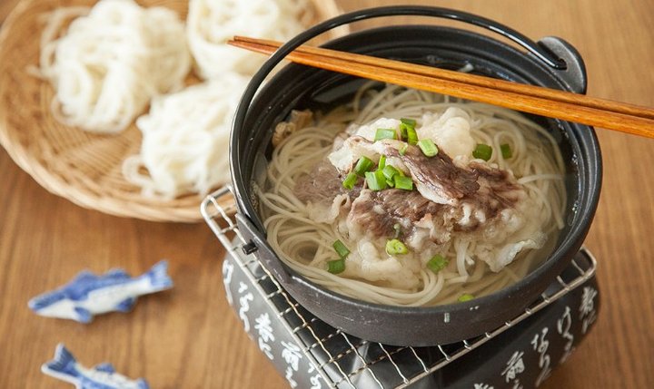 육수에 쯔유와 소금을 넣어 간하고, 미리 삶아둔 면을 넣어 한 번 더 팔팔 끓인 뒤 그릇에 담고, 다진 쪽파, 미리 구워둔 차돌박이를 곁들여 낸다.