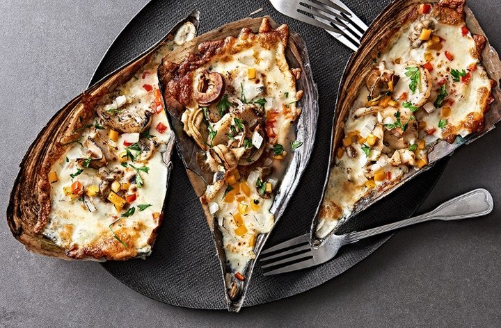 키조개 껍질 위에 2를 넣고 모차렐라 치즈와 3을 골고루 올려 200도로 예열된 오븐에서 10~15분 치즈가 노릇해질 때까지 구워 완성한다.