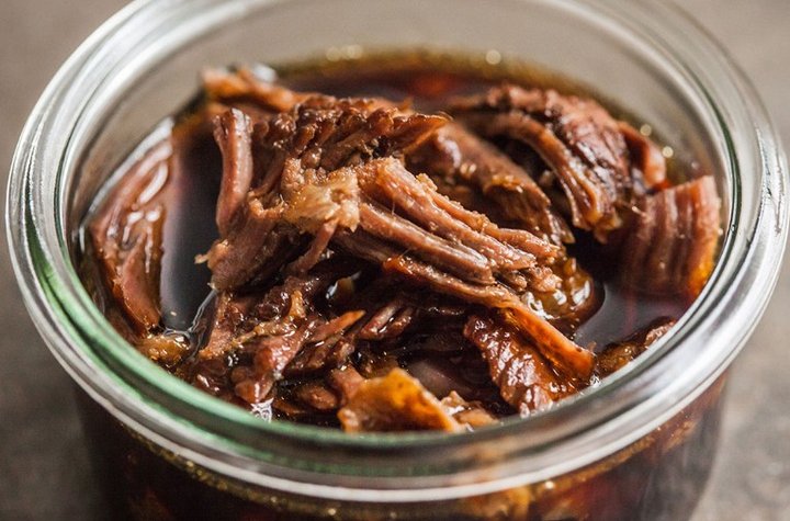 졸여진 장조림 고기를 식힌 뒤 먹기 좋은 크기로 찢어 그릇에 담는다. 그 위에 남은 국물을 얹어주면 촉촉하고 부드러운 장조림이 완성된다.